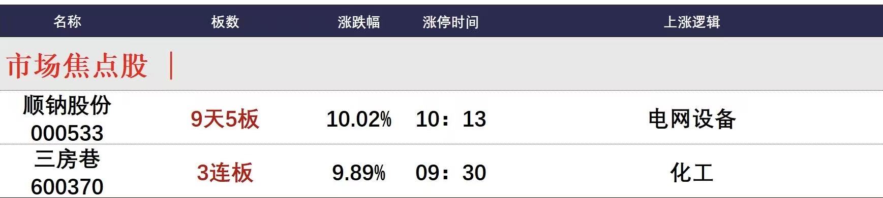 今日午盘全市场共30股涨停,连板股总数3只,22股封板未遂,封板率为58%(不含ST股、退市股)。焦点股方面,电网设备板块顺钠股份9天5板,化工股三房巷3连板。